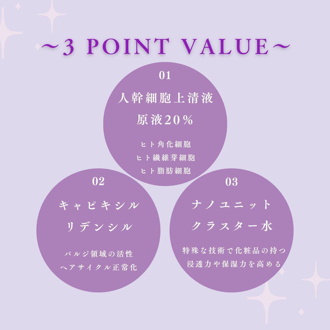 水、ヒト脂肪細胞順化培養液、ヒト角化細胞順化培養液、ヒト線維芽細胞順化培養液、BG、ジグリセリン、ペンチレングリコール、グリセリン、アセチルテトラペプチド-3、アカツメクサ花エキス、ピロ亜硫酸Na、グリシン、塩化亜鉛、セイヨウアカマツ球果エキス、チャ葉エキス、グリチルリチン酸2K、アラントイン、トレハロース、加水分解ヒアルロン酸、シクロヘキサン-1,4-ジカルボン酸ビスエトキシジグリコール、リンゴ酸、リンゴ酸Na、ヒドロキシエチルセルロース、乳酸桿菌/アセロラ葉発酵液、アルギニン、フィチン酸、酸化銀