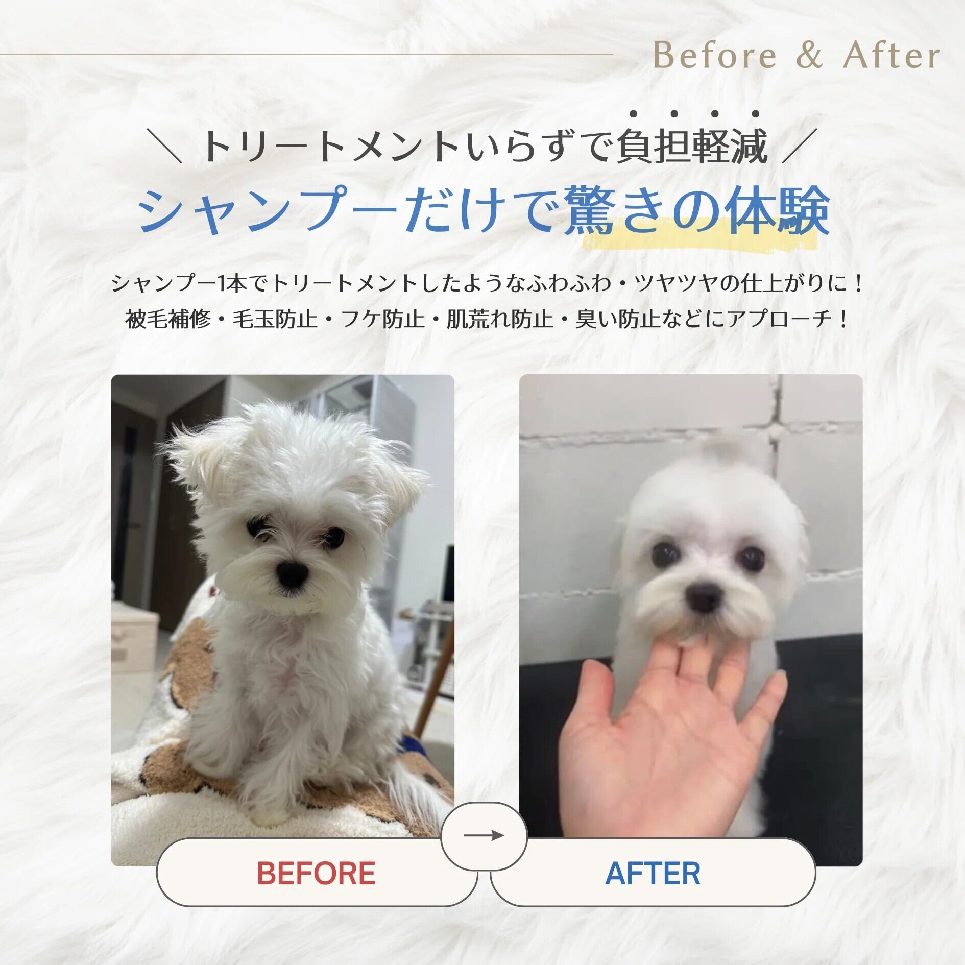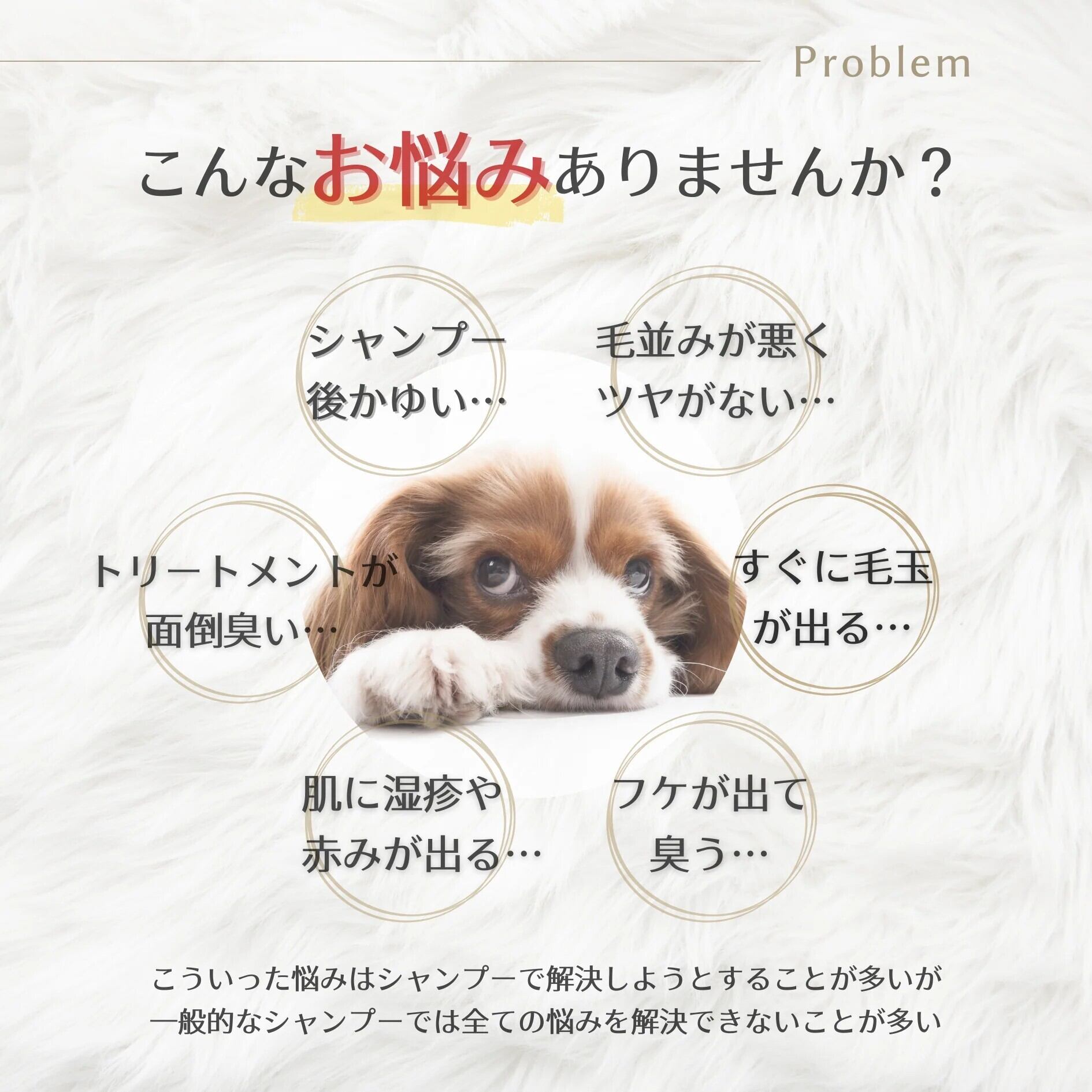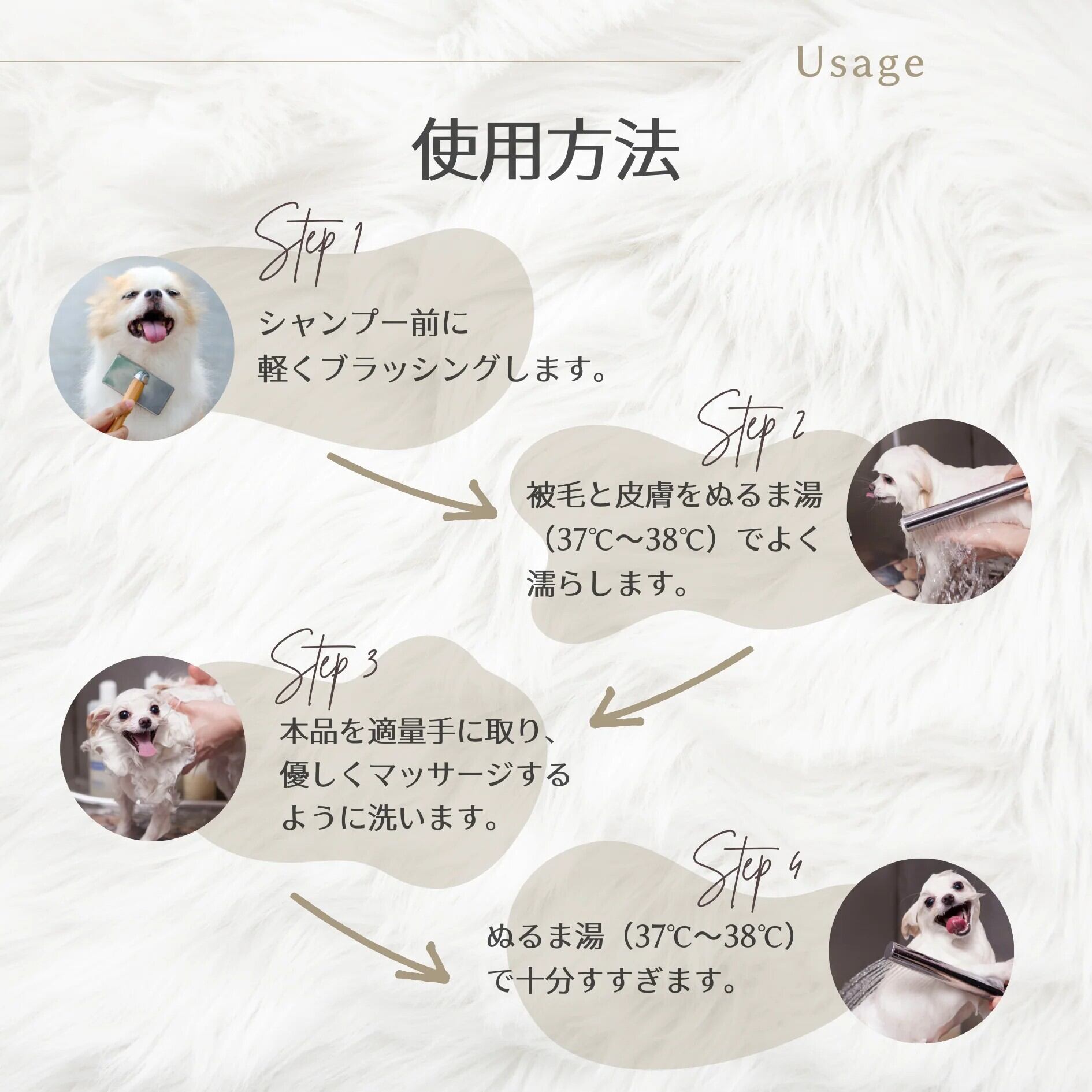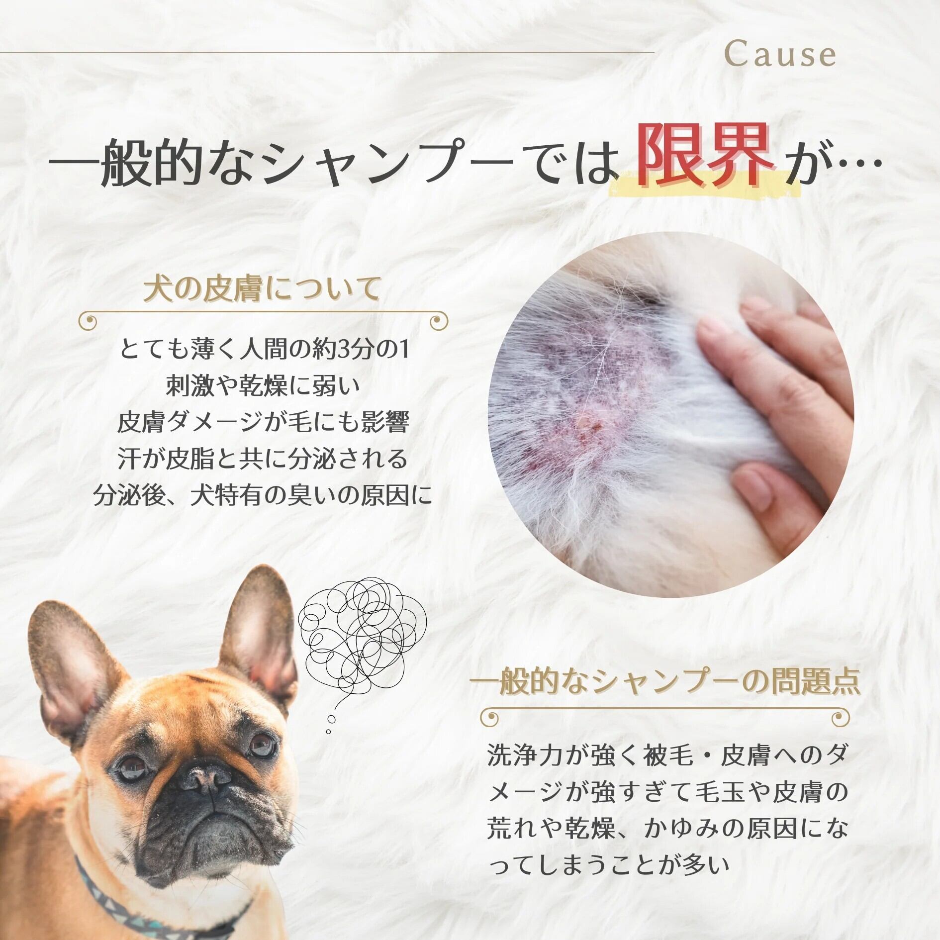ワンちゃんの被毛・皮膚の特性を考え、両方にアプローチできる究極のオールインワンシャンプーです。化粧品と同じ工場で生産し、安心安全はもちろんのこと、NUC|ナノユニットクラスター技術で保湿補修を実感できるペットシャンプーです。